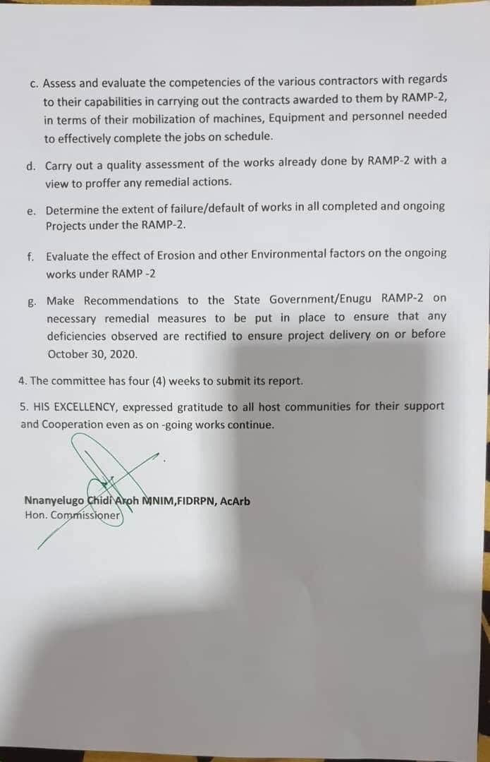Other specific objectives are to “carry out a quality assessment of the works already done by RAMP-2 with a view to proffer any remedial actions; determine the extent of failure/default of works in all completed and ongoing projects under the RAMP-2; evaluate the effect of erosion and other environmental factors on the ongoing works under RAMP -2; make recommendations to the state government/Enugu RAMP-2 on necessary remedial measures to be put in place to ensure that any deficiencies observed are rectified to ensure project delivery on or before October 30, 2020.”