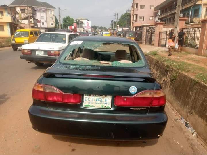 According to the report, the gunmen, numbering about ten, who drove in black Honda Pilot Sports Utility Vehicle (SUV), equally hoisted Biafran flag at the gate of the bank, set fire on a Nissan Pathfinder SUV with registration number UR 640 KJA, and smashed glasses of a Honda car with registration number FST 456 AC, all parked in front of the bank.