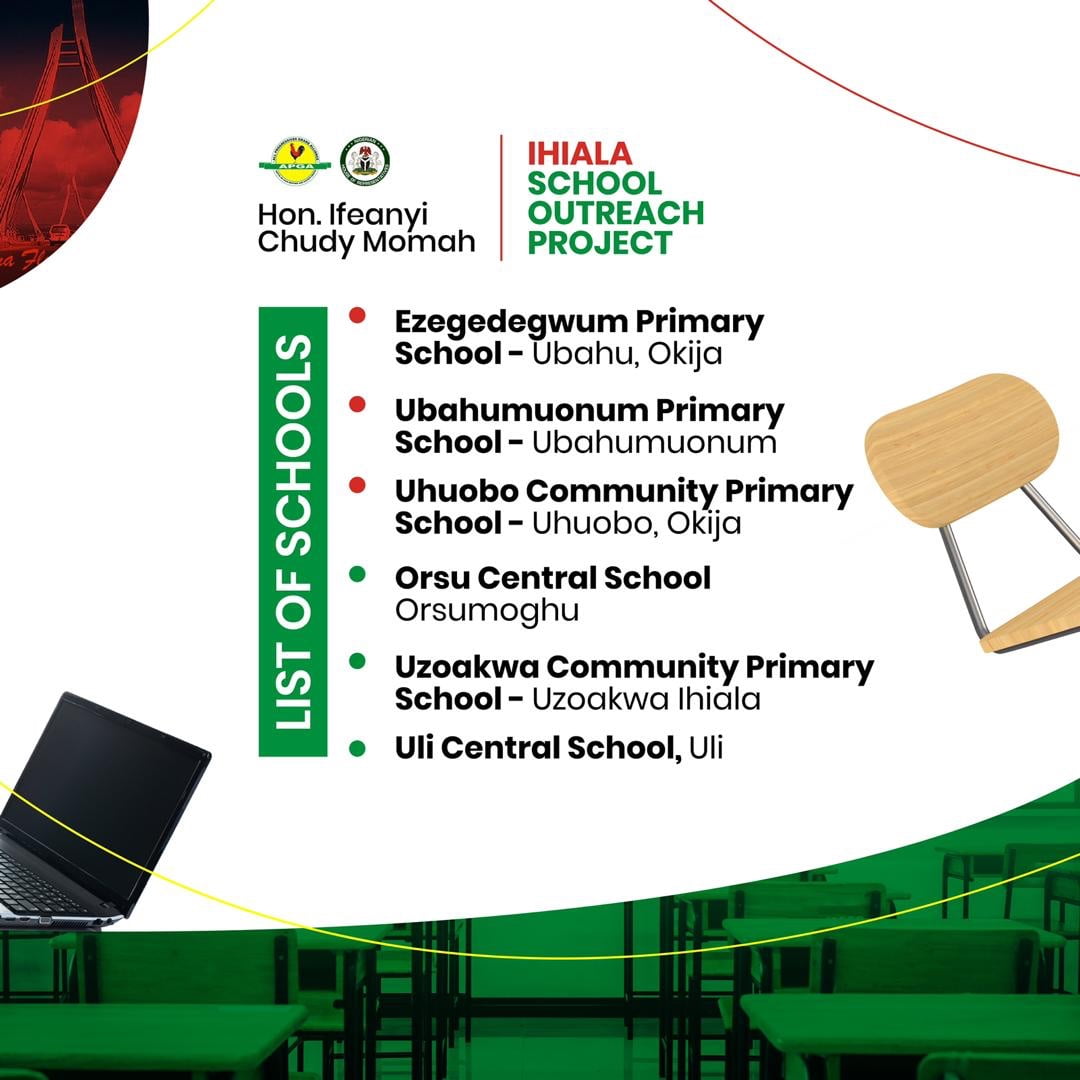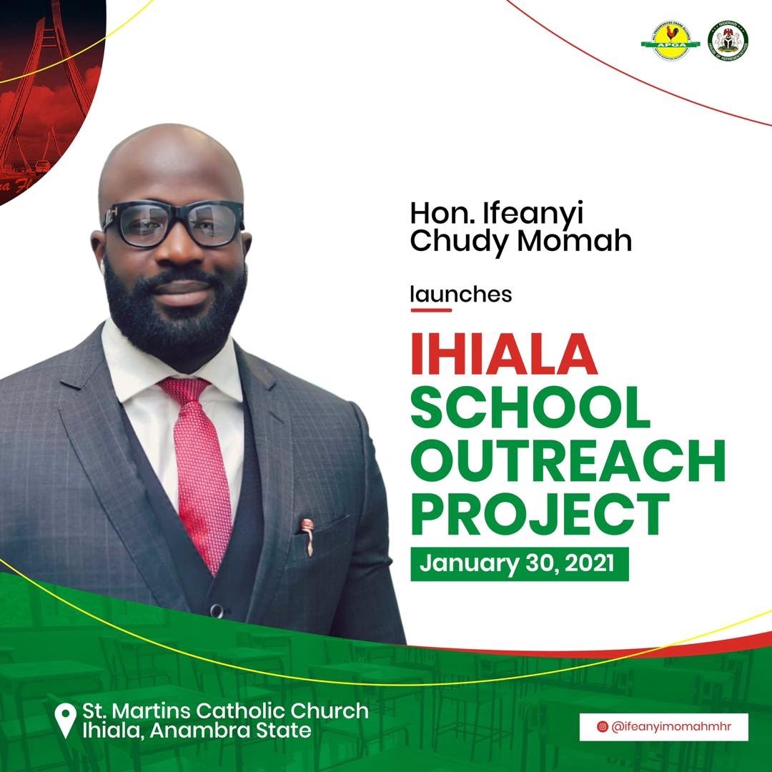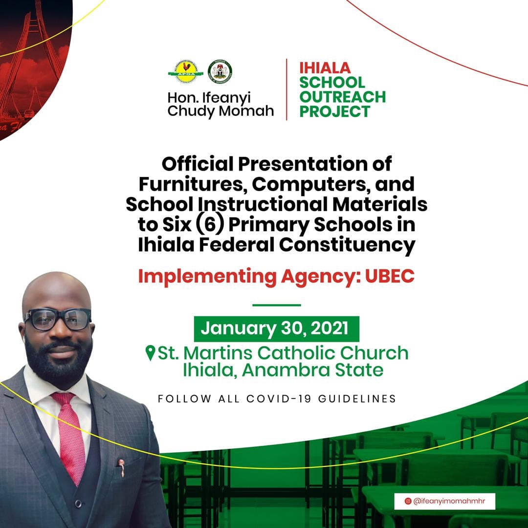 The Member representing Ihiala Federal Constituency, Anambra State at the House of Representatives, Hon. Ifeanyi Chudy Momah is set to officially present educational furnitures, materials and ICT equipments to primary schools within the constituency on Saturday, 30th January, 2021.