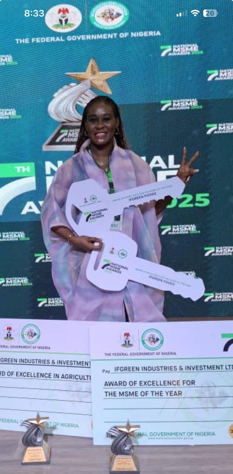 Ifgreen Foods was named the National MSME of the Year and also the Award of Excellence in Agriculture 2025 , a landmark achievement announced at the State House Banquet Hall in Abuja, Nigeria. The award, which recognizes outstanding performance, innovation, and impact among small and medium enterprises nationwide, was presented to Ifeoma Mary Okonkwo, the Group Managing Director of Ifgreen Industries and Investment Ltd.