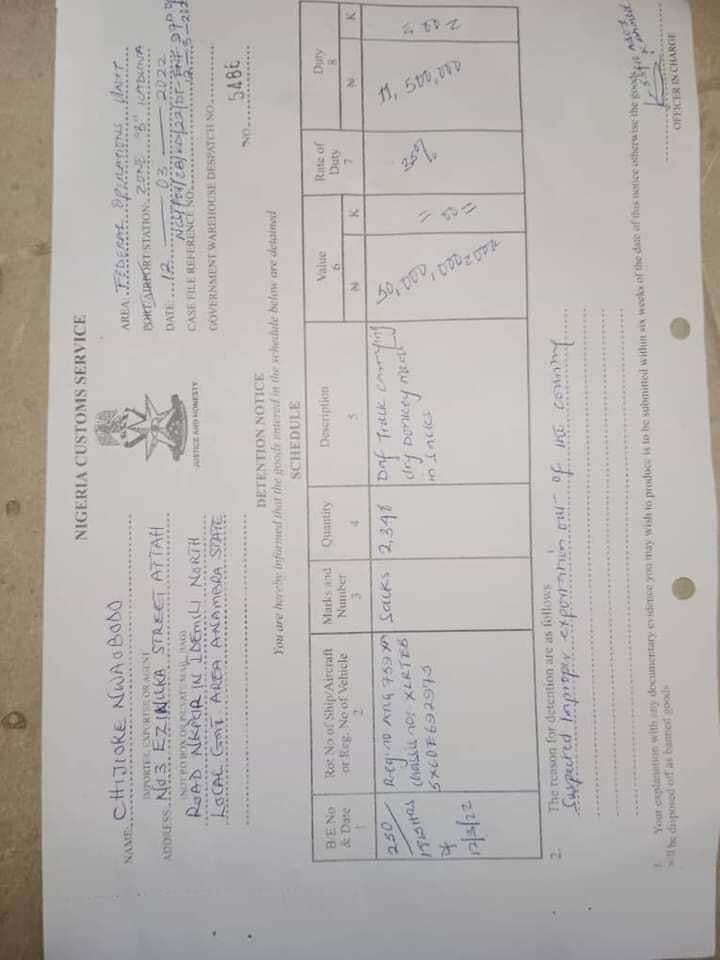 They presented a document that we are supposed to Pay Eleven Million Naira (11,000,000) as Duty for the goods