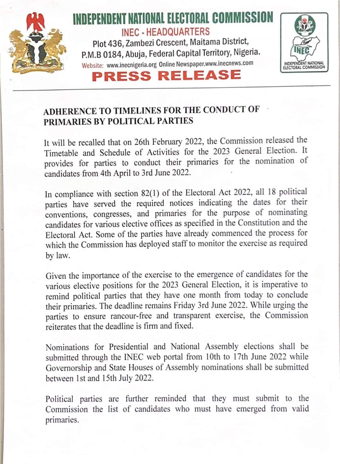 It will be recalled that on 26th February 2022, the Commission released the Timetable and Schedule of Activities for the 2023 General Election. It provides for parties to conduct their primaries for the nomination of candidates from 4th April to 3rd June 2022.