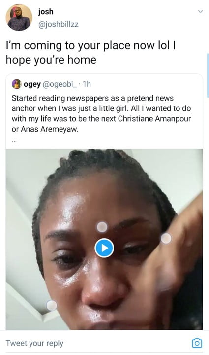 After days of hot heavy debate on the case on twitter, Oge posted a video suggesting she was contemplating suicide on social media alongside other posts and her friend, Josh (@joshbillzz) said he was going to check on her.