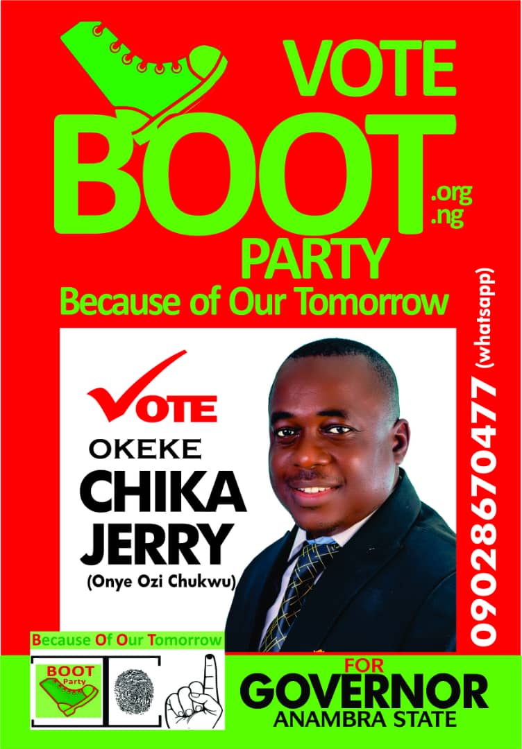 Having me as their governorship candidate, it’s only the BOOT party that is well positioned to lead Anambra aright if I am elected. I am a new face in government without a godfather. I am young, educated, vibrant and active. I know Anambra very well because I live here with the people.