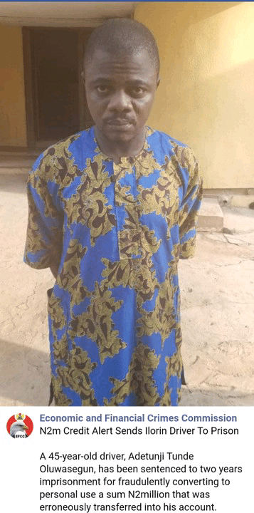 A 45-year-old driver, Adetunji Tunde Oluwasegun, has been sentenced to two years imprisonment for fraudulently converting to personal use a sum N2million that was erroneously transferred into his account.