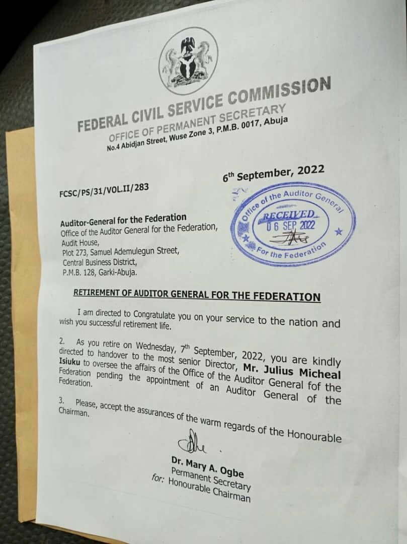 The appointment was communicated in a letter to the office of the Auditor General for the Federation Ref. No. FCSC/PS/31/VOL.II/283 dated 6th September, 2022. Mr Isiuku is the most senior director in the office.