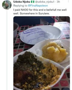 Nigerian journalist Fina Napoleon has expressed frustration after being served a paltry plate of food costing N3,800 at a restaurant on the island in Lagos.