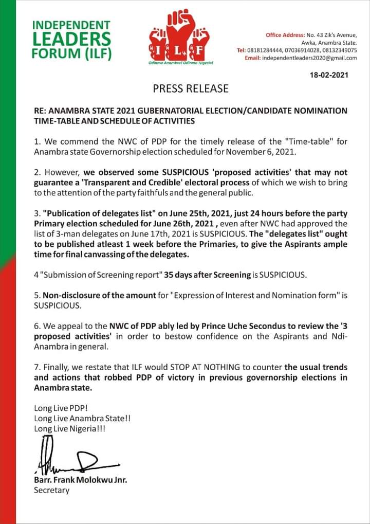 A group operating under the People’s Democratic Party, PDP in Anambra state has faulted the ANAMBRA STATE 2021 GUBERNATORIAL ELECTION/CANDIDATE NOMINATION TIME-TABLE AND SCHEDULE OF ACTIVITIES released by the National Working Committee of the party.