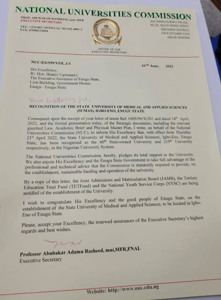 The National Universities Commission (NUC) has granted license to Enugu State Government recognising establishment of the State University of Medical and Applied Sciences (SUMAS), Igbo-Eno, Enugu State.