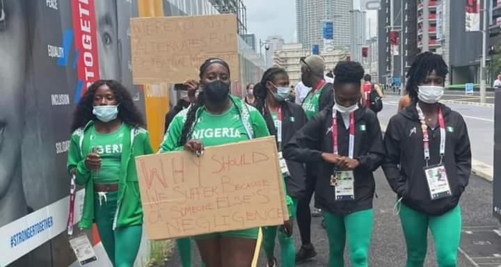 Nigerian athletes staged a protest in Tokyo after 10 of them were disqualified from taking part in the the track and field events of the 2020 Tokyo Olympic Games.