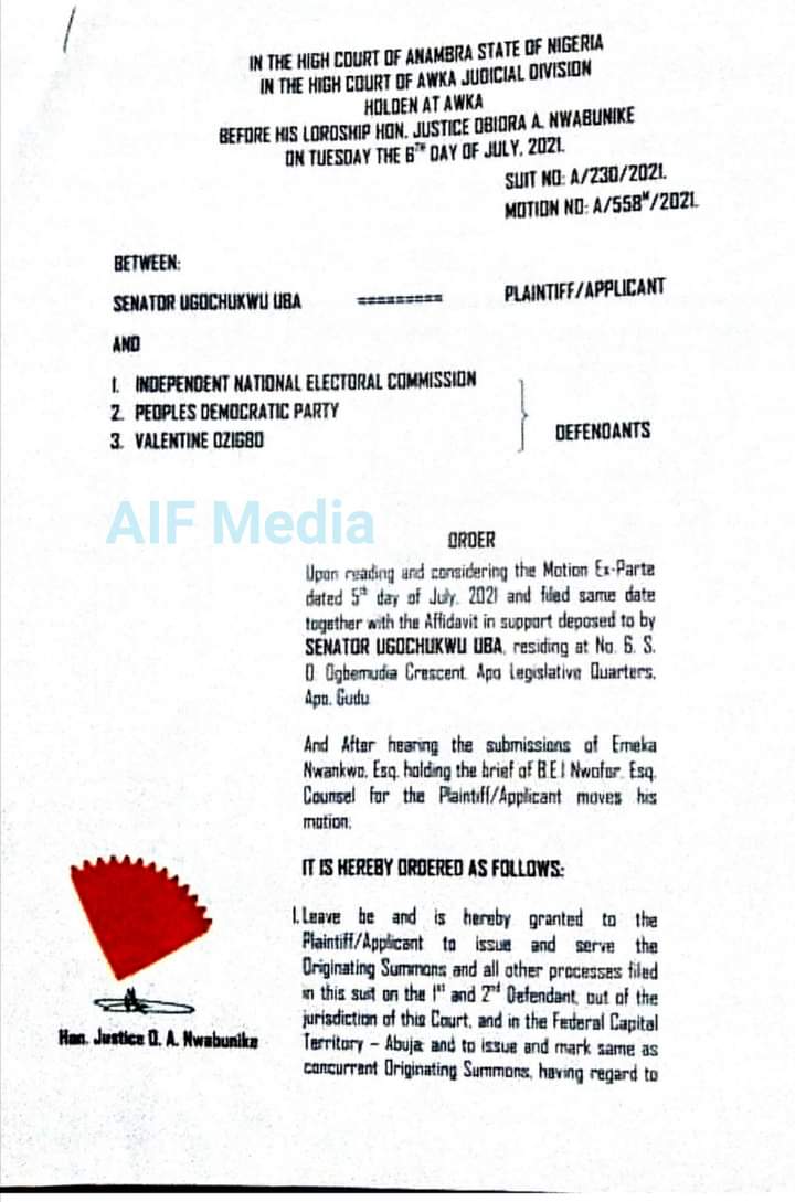 Senator Ugochukwu Uba, the factional governorship candidate of PDP has secured an order of the court against Valentine Chineto Ozigbo , PDP and INEC.