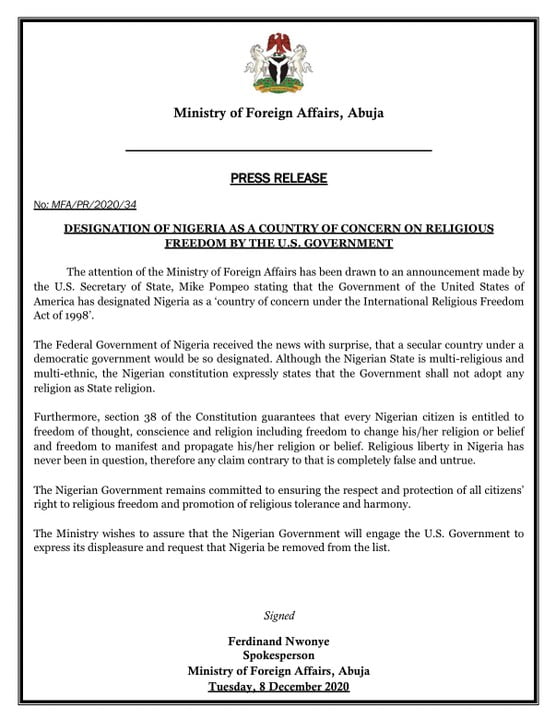 in News Presidency React To US List Of Countries Which Practice Religious Intolerance by Essential Ndubuisi December 9, 2020, 7:48 am STATEMENT by @NigeriaMFA on the designation of Nigeria as a Country of on Religious Freedom by the US Government @StateDept https://twitter.com/NGRPresident/status/1336388684288053253?s=19 WhatsApp Facebook Twitter LinkedIn See more Previous article Lady Sues Boyfriend : See Why Next article Ronaldo Outshines Messi As Juventus Beat Barcelona Leave a Reply Cancel replyYou must be logged in to post a comment.