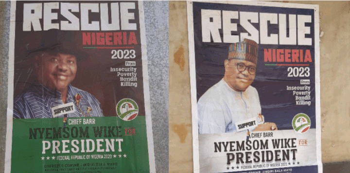 The posters which bear the logo of PDP read, “Rescue Nigeria from insecurity, poverty, bandit killing. Support Chief Barr Nyesom Wike for President, Federal Republic of Nigeria 2023.”