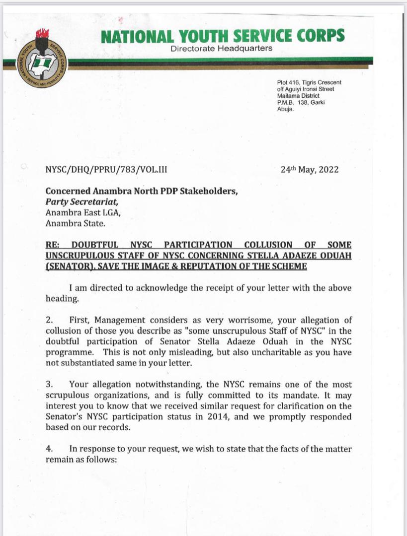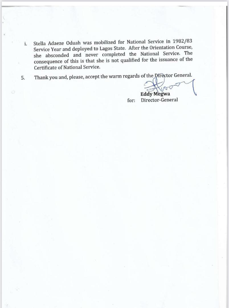 The letter reads in part: “In response to your request, we wish to state that the facts of the matter remain as follows: Stella Adaeze Oduah was mobilised for national service in 1982/1983 service year and deployed to Lagos State.