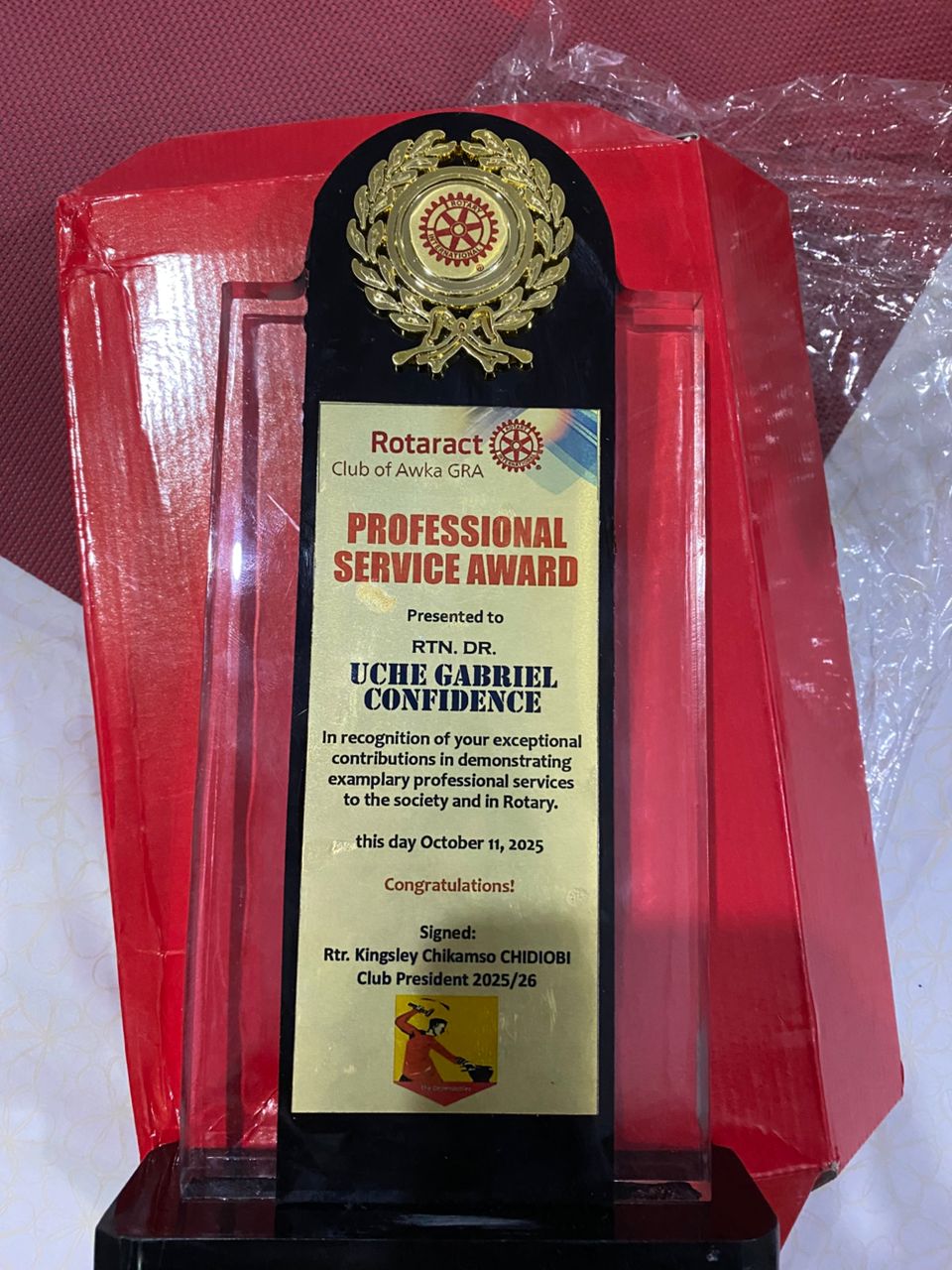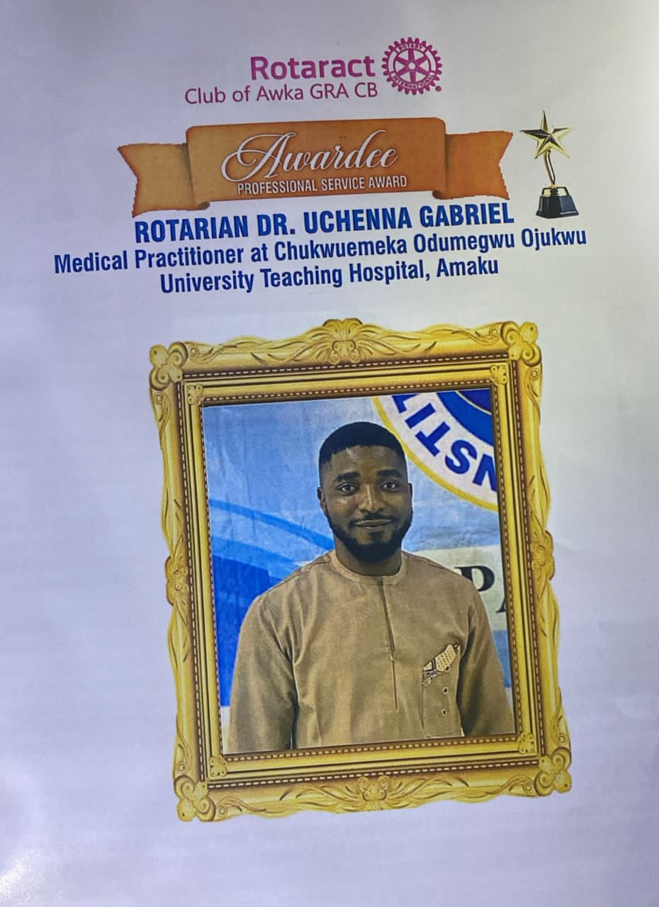 The Rotaract Club of Awka GRA has honoured Rtn. Dr. Uche Gabriel Confidence with its prestigious Professional Service Award for his outstanding contributions to professional excellence and community development.