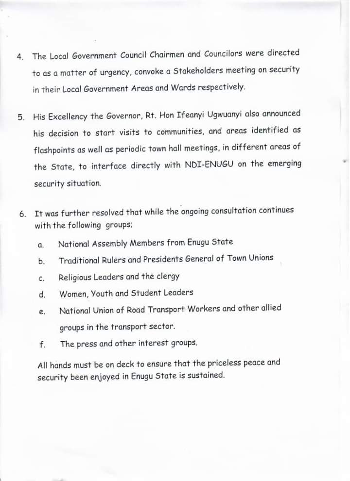 “It was further resolved that while the ongoing consultation continues with the following groups; National Assembly Members from Enugu State; Traditional Rulers and Presidents General of Town Unions; Religious Leaders and the Clergy; Women, Youth and Student Leaders; National Union of Road Transport Workers and other allied groups in the transport sector; The press and other interest groups, all hands must be on deck to ensure that the priceless peace and security been enjoyed in Enugu State are sustained”, the statement said.