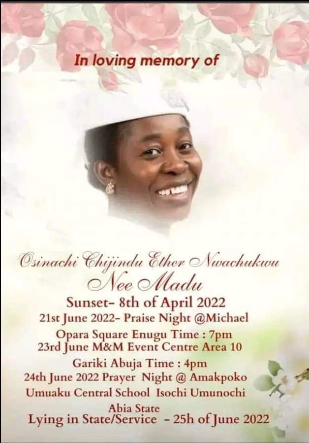 According to her obituary poster, a night of worship will hold in Abuja on Thursday, June 23 while a Night of Prayer will hold in Isochi, Umunoci in Abia state on June 24. She will be interred in her father’s compound on Saturday, June 25.