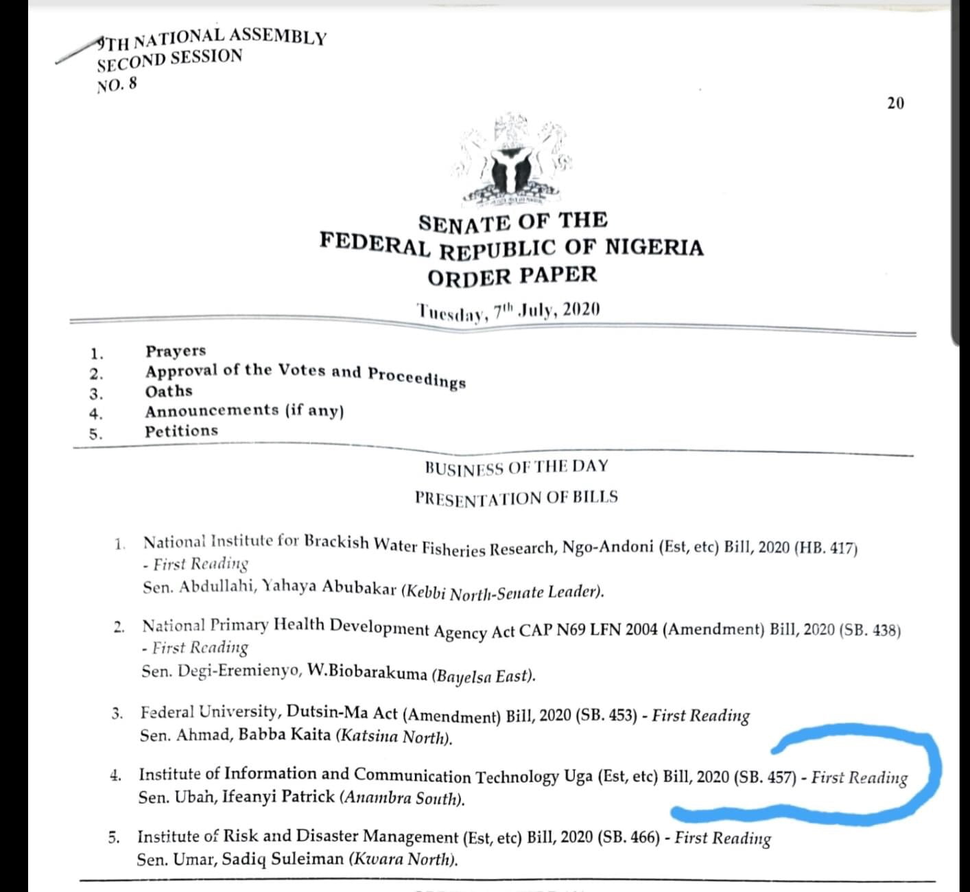 “To the glory of God; as part of my efforts to bridge the information and communications technological gap in Anambra South, today being Tuesday, July 7, 2020, I sponsored a bill to establish an Institute of Information and Communication Technology in Uga, Aguata, Anambra State.