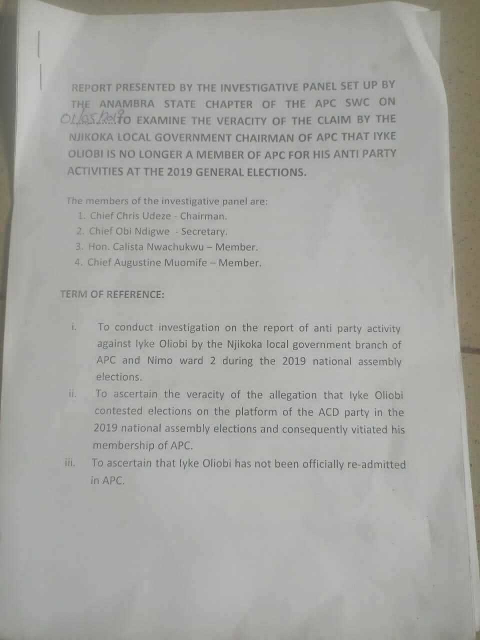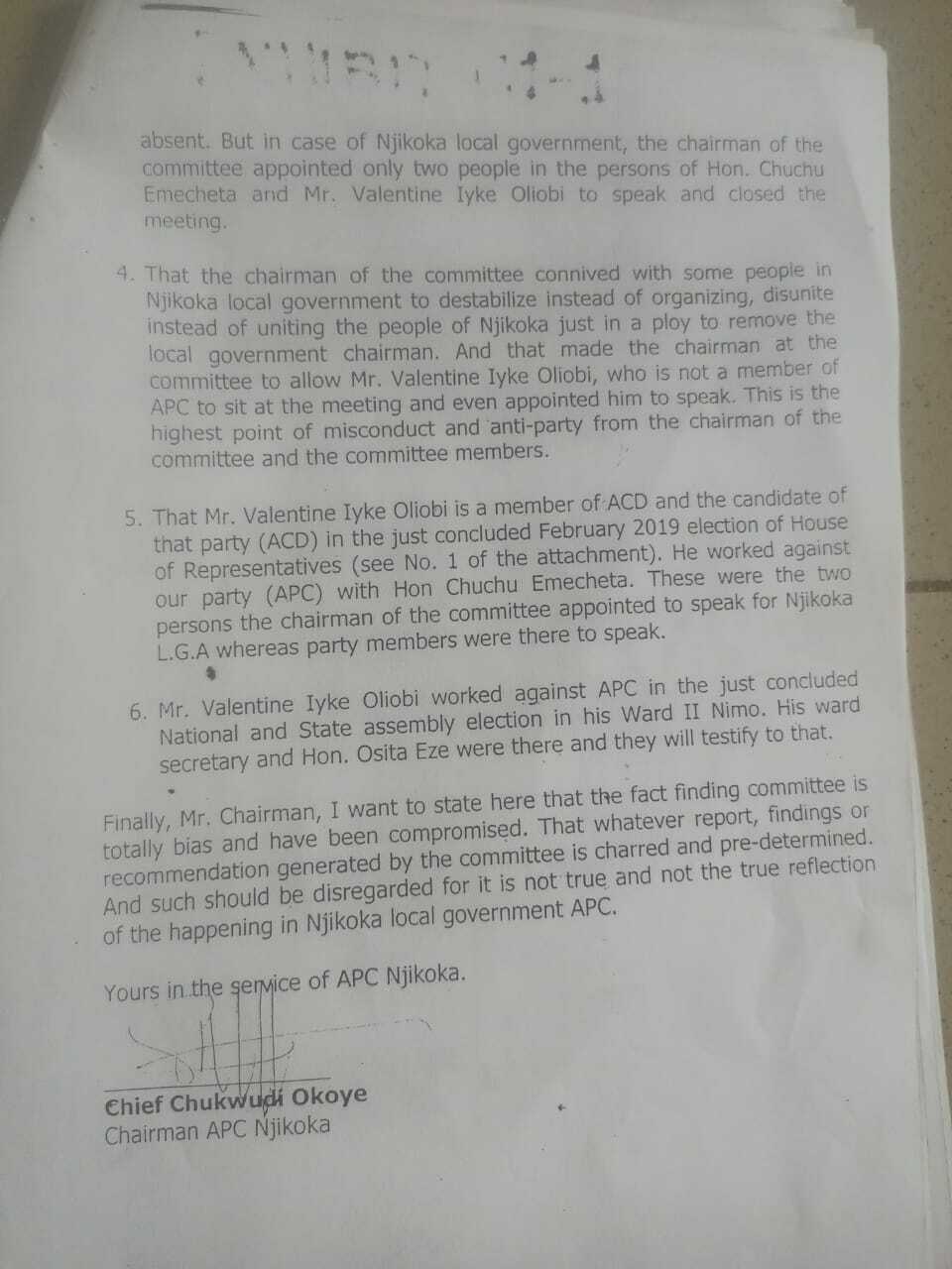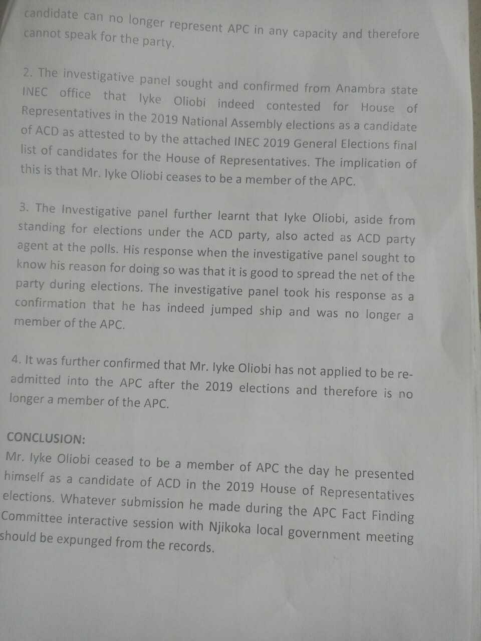 One of the Groups, Coalition of South East APC, he maintained that no such group exist either at APC National or South East APC Zonal Office for they are unknown to the Party. He described the Spokesman of the group, One Iyke Oliobi as Ex- Member of APC in Anambra State, who has been expelled from the Party Long time in his State Anambra State. For avoidance of doubt, this is the records of his disciplinary action by the Party during the Tenure of Chief Basil Ejidike and it is on record till date that he has not been recalled to the Party. So, how can he be speaking for The Members of the Party he is not a member in the first place. *see attached the documents of his expulsion from the Party two years ago.*