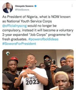 Mr Sowore, a human rights activist, on Monday tweeted, that “As President of Nigeria, what is NOW known as National Youth Service Corps @officialnyscng would no longer be compulsory, instead it will become a voluntary 2-year expanded “Job Corps” programme for fresh graduates.”