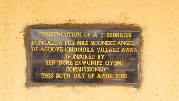 In continuation of her projects commissioning and inspection tour, the Senator representing Anambra Central Senatorial District, Uche Ekwunife has today, Tuesday, April 20, 2021, commissioned another 3-bedroom bungalow she built for a crippled woman, Mrs Angela Muoneke and her husband, Mr Ikechukwu Muoneke at Umudioka village, Awka, Awka South LGA.