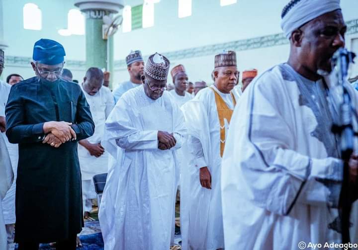 “Jumat prayers at Dantata Mosque, Abuja with APC Presidential Candidate Asiwaju Bola Ahmed Tinubu, Vice-Presidential Candidate, Sen. Kashim Shettima and other worshippers.”