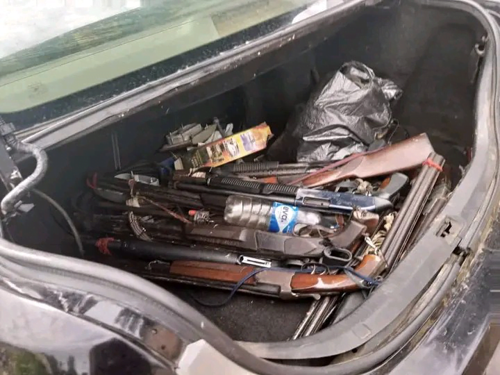 After a thorough search, the troops recovered ten Pump Action Shotguns, seven locally fabricated guns, one locally made Revolver Pistol, eighty Live Cartridges, one Baofeng Radio and substance suspected to be gun powder.Others include Satchet of Improvised Explosive Device (IED) and a Toyota Camry Saloon car.