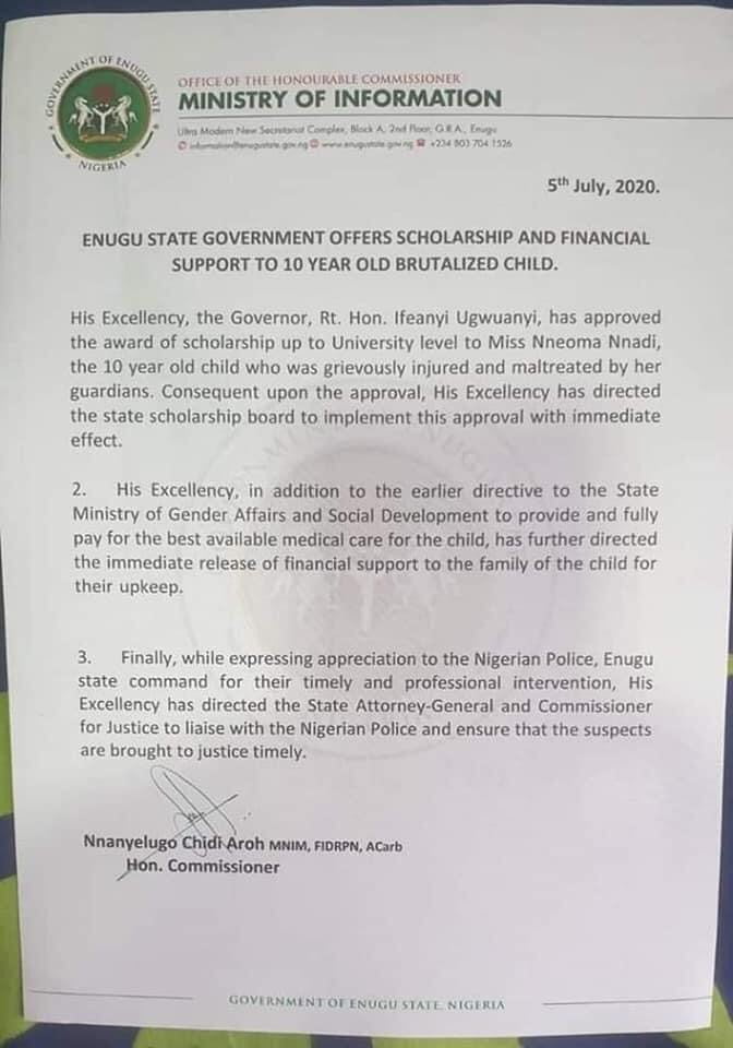 In furtherance of the Enugu State government’s contributions to the wellbeing and quick recovery of Miss Nneoma Nnadi, the 10-year-old female househelp, who was brutally injured and maltreated by her guardians, Mrs. Ifeoma Ozougwu and her husband, Mr. Jude Ozougwu, Governor Ifeanyi Ugwuanyi has approved the award of scholarship, up to university level, to the little girl.