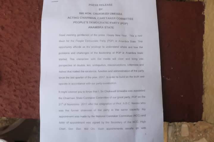 The new state chairman of PDP in Anambra state, Chief Chukwudi Umeaba has taken over the affairs of PDP in the state. Chief Umeaba who is a loyalist of Dr Chris Ubah, Eselu Uga held a press conference today at Awka where he gave accounts of the issues leading to the court judgement that sacked Ndubuisi Nwobu and returned him as the acting state Chairman of PDP in the state.