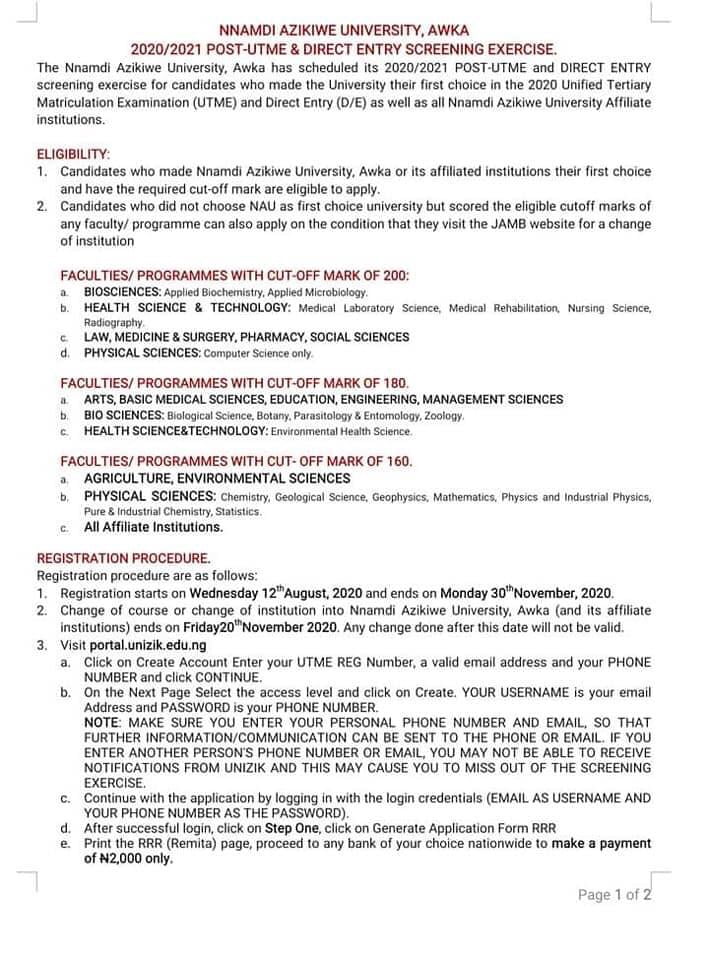 The Nnamdi Azikiwe University, Awka has scheduled its 2020/2021 POST-UTME and DIRECT ENTRY screening exercise for candidates who made the University their first choice in the 2020 Unified Tertiary Matriculation Examination (UTME) and Direct Entry (D/E) as well as all Nnamdi Azikiwe University Affiliate institutions.