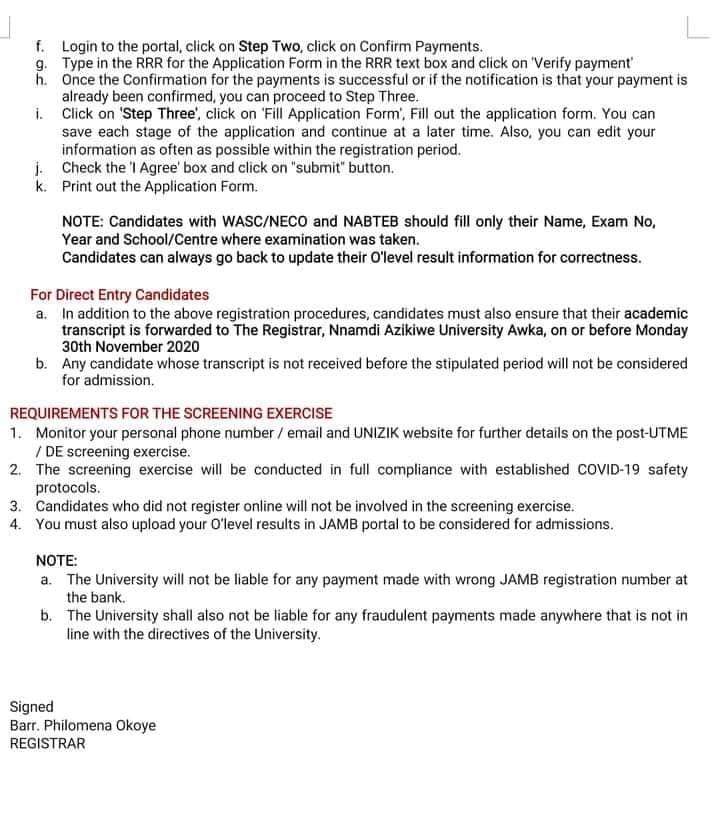 In addition to the above registration procedures, candidates must also ensure that their academic transcript is forwarded to The Registrar, Nnamdi Azikiwe University Awka, on or before Monday 30th November 2020.