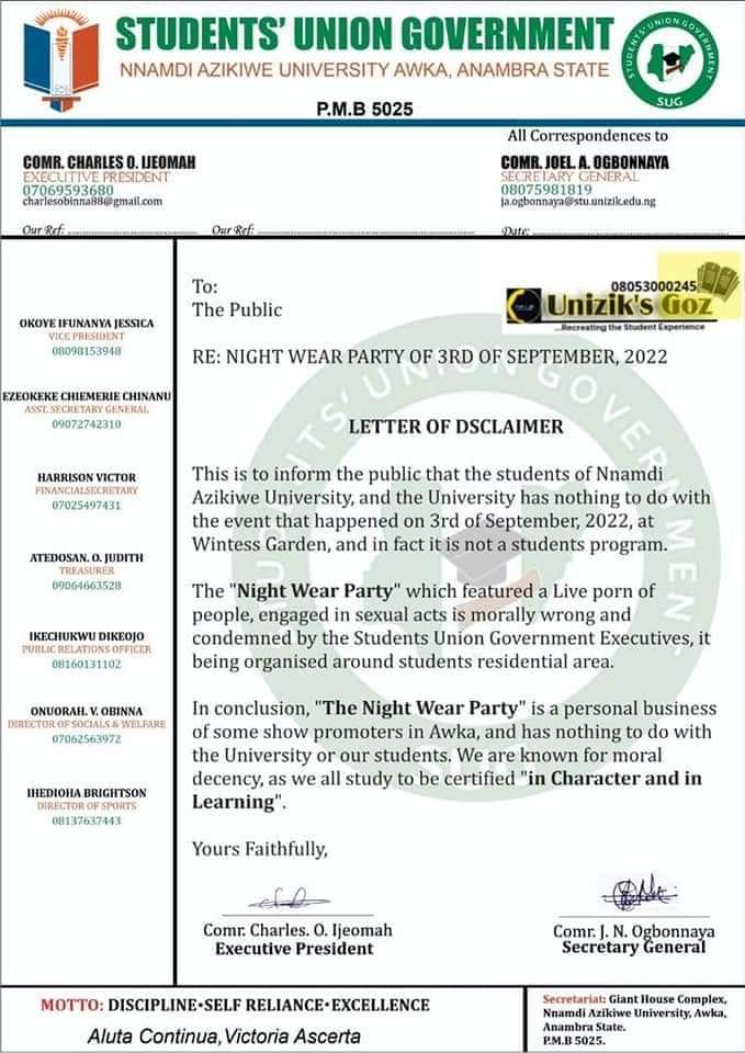 The Students Union Government of Unizik has dissociated the entire Students of Unizik from such immorality. They claimed that school is not in session and students are at home. The Union absolved Unizik Students from the party at Wintess Garden claiming that it is not a students program.