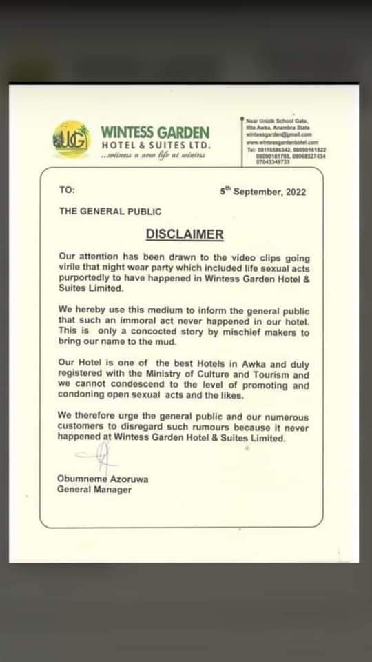 While Unizik SUG claimed that the party actually happened at Wintess Garden but the students of Unizik were not involved, the Hotel Management insisted that such never happened in their facility.
