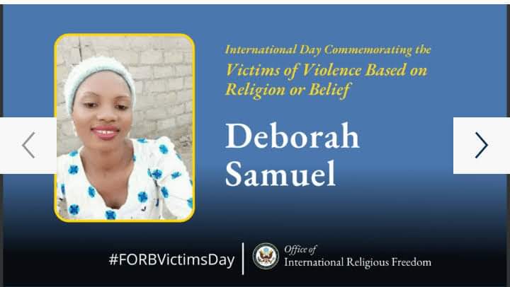 The United States Government has honoured Deborah Samuel, the 200-level student of the Shehu Shagari College of Education (SSCOE), Sokoto, who was stoned to death on campus by some Islamic extremists for blasphemy on May 12.