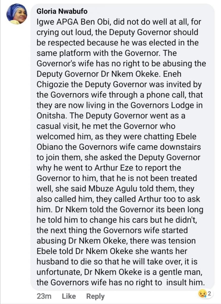 “Igwe APGA Ben Obi, did not do well at all, for crying out loud, the Deputy Governor should be respected because he was elected in the same platform with the Governor. The Governor’s wife has no right to be abusing the Deputy Governor Dr Nkem Okeke. Eneh Chigozie the Deputy Governor was invited by the Governors wife through a phone call, that they are now living in the Governors Lodge in Onitsha. The Deputy Governor went as a casual visit, he met the Governor who welcomed him, as they were chatting Ebele Obiano the Governors wife came downstairs to join them, she asked the Deputy Governor why he went to Arthur Eze to report the Governor to him, that he is not been treated well, she said Mbuze Agulu told them, they also called him, they called Arthur too to ask him. Dr Nkem told the Governor its been long he told him to change his cars but he didn’t, the next thing the Governors wife started abusing Dr Nkem Okeke, there was tension Ebele told Dr Nkem Okeke she wants her husband to die so that he will take over, it is unfortunate, Dr Nkem Okeke is a gentle man, the Governors wife has no right to insult him.” ~ Gloria Nwabufo.