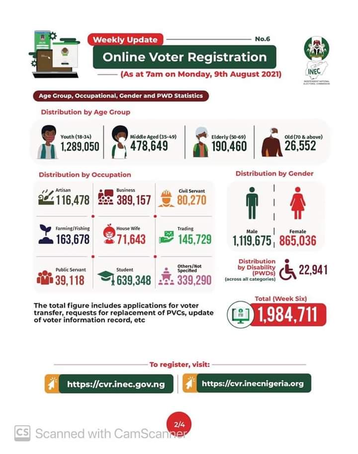 The Independent National Electoral Commission, INEC, says as the online pre-registration of voters enteres its seventh week, the number of online fresh registrants is now one million, six hundred and nine thousand, nine hundred and eighty one while one hundred and ninety five thousand, five hundred and ninety one citizens have completed their physical registration.