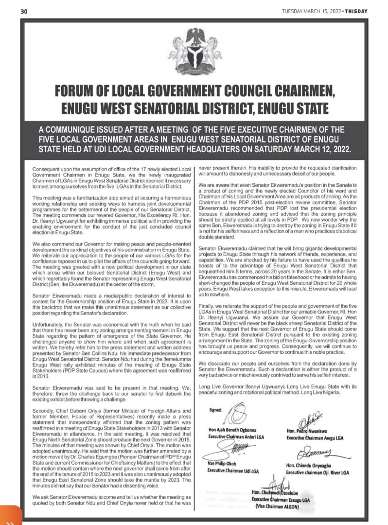 The Local Government Chairmen in Enugu West Senatorial District of Enugu State have joined in the ongoing zoning controversy in Enugu State, accusing the Senator representing the senatorial district, Senator Ike Ekweremadu of being economical with the truth.