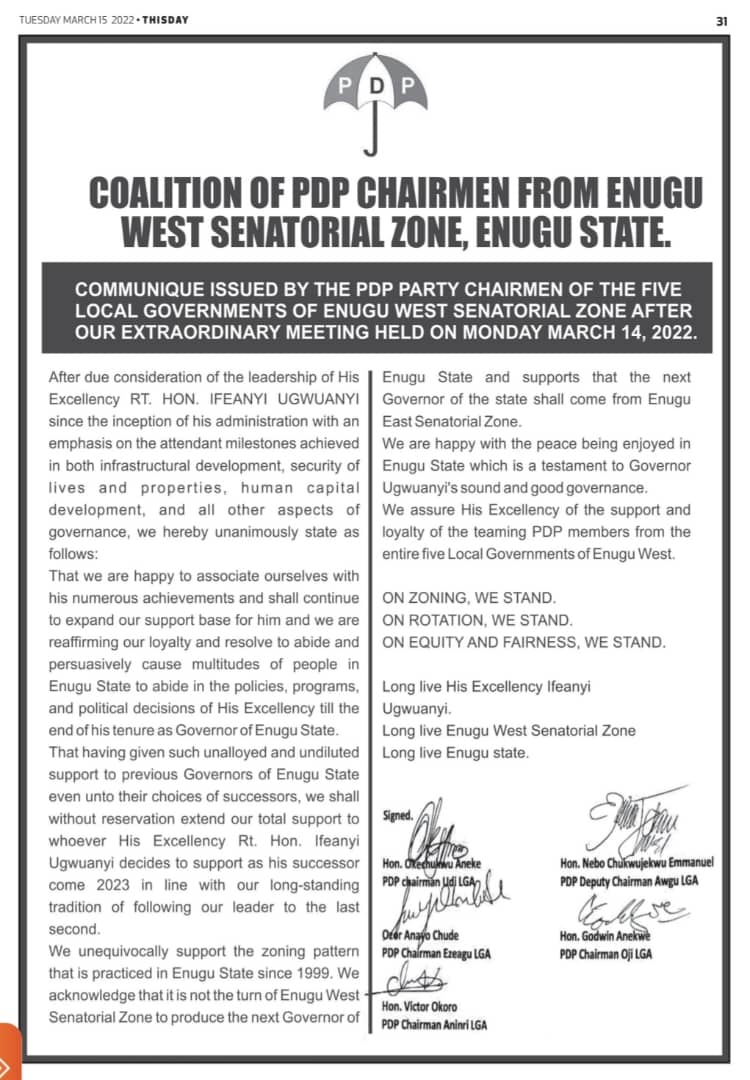 “We unequivocally support the zoning pattern that is practiced in Enugu State since 1999. We acknowledge that it is not the turn of Enugu West Senatorial Zone to produce the next Governor of Enugu State and supports that the next Governor of the state shall come from Enugu East Senatorial Zone.
